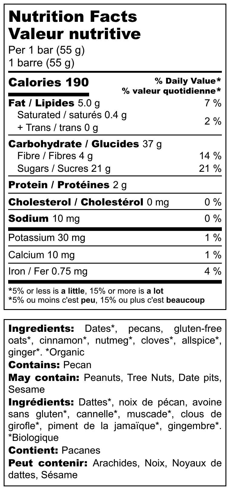 Organic dates, gluten-free oats, pecans, organic spice blend (ginger, cinnamon, cloves,  allspice, and nutmeg.